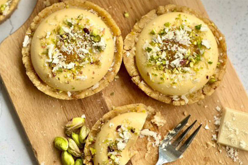 16. Versier de taartjes met nog wat gehakte pistache nootjes en witte chocolade krullen.